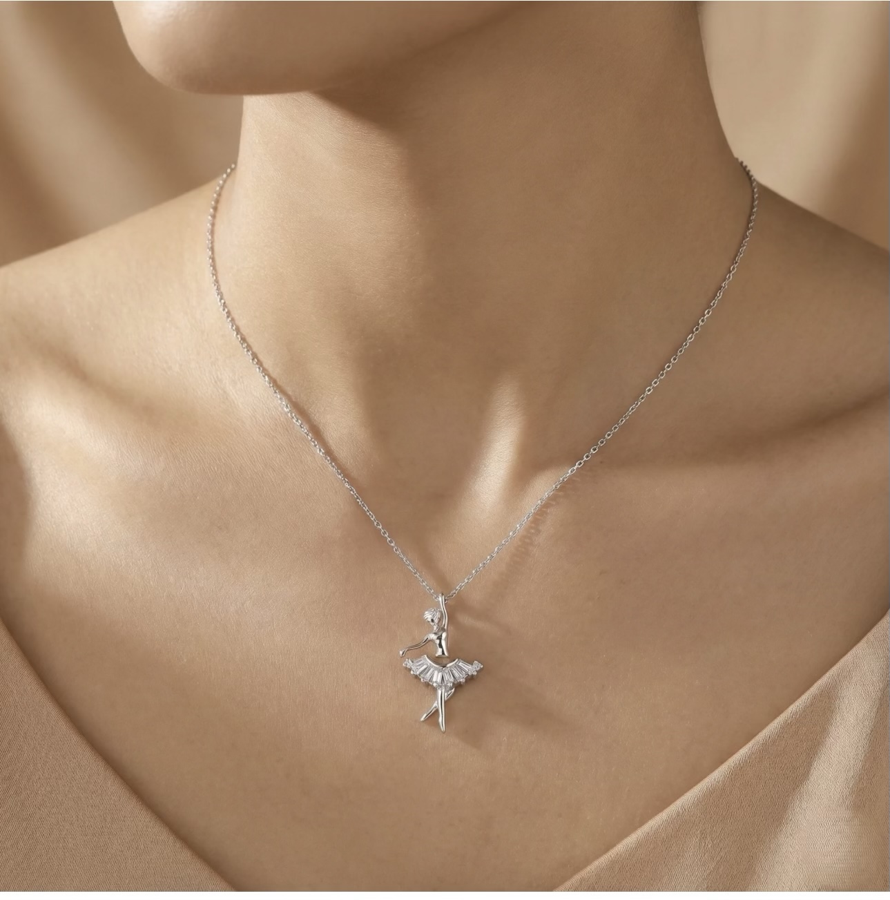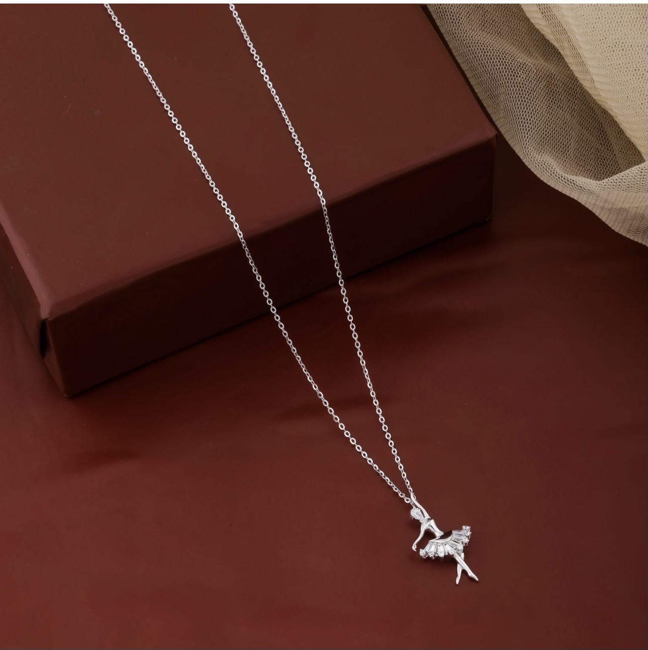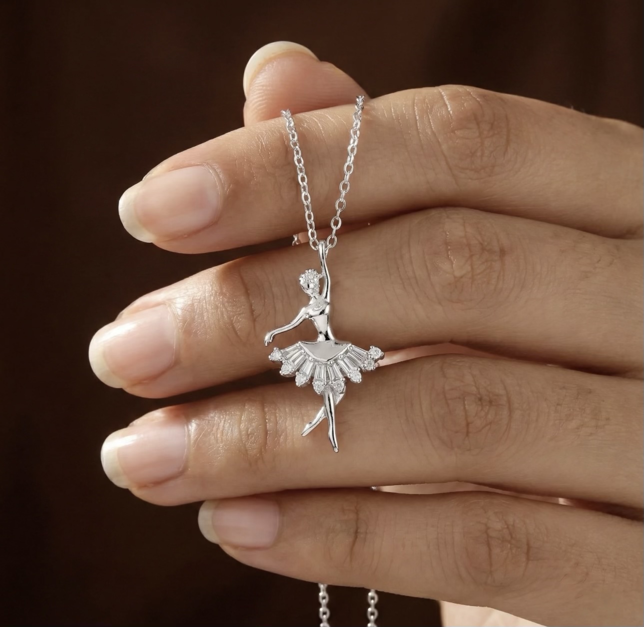 A whisper of grace meets everyday luxury in this ballerina-inspired 925 silver necklace, designed to capture motion, emotion, and refined sparkle in one timeless piece. Crafted from hallmarked 925 sterling silver and hand-polished to a luminous, mirror-bright finish, the sculpted dancer glides across a pavé-set CZ chowki skirt that reflects light with elegant restraint.