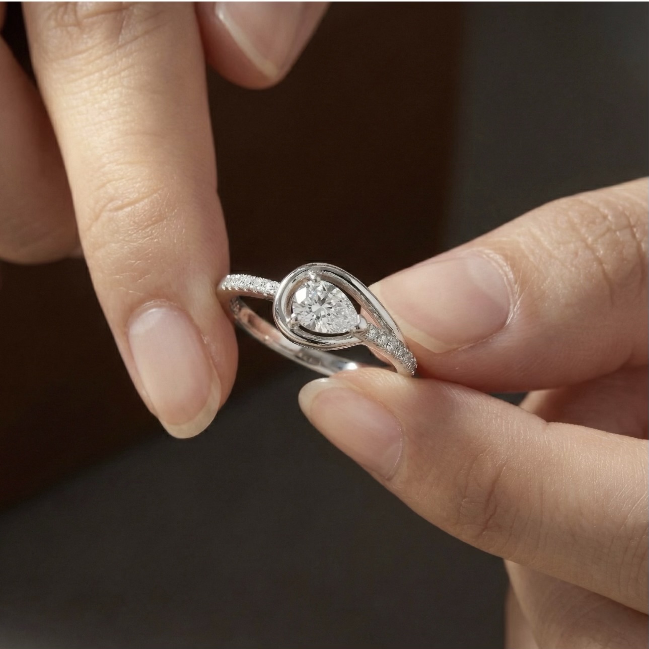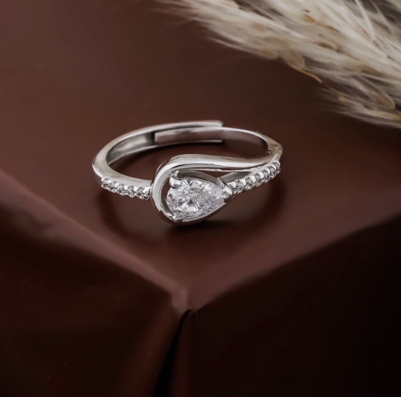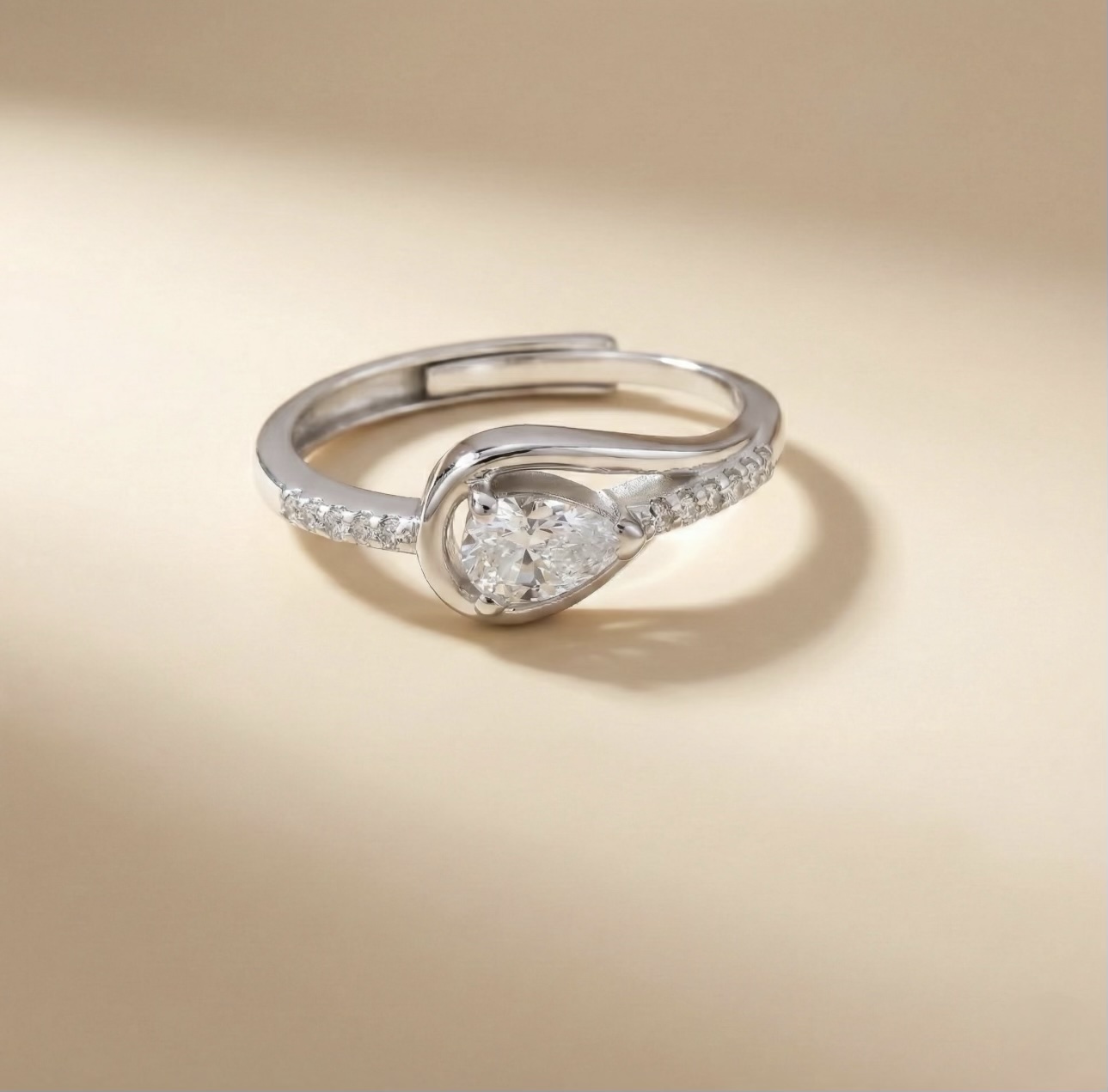 A modern symbol of timeless love. This elegant ring features a pear-shaped diamond embraced by a graceful, fluid band accented with sparkling pavé stones. Crafted in polished white metal, its sculpted curve design creates a soft, romantic silhouette perfect for everyday elegance or a meaningful gift.